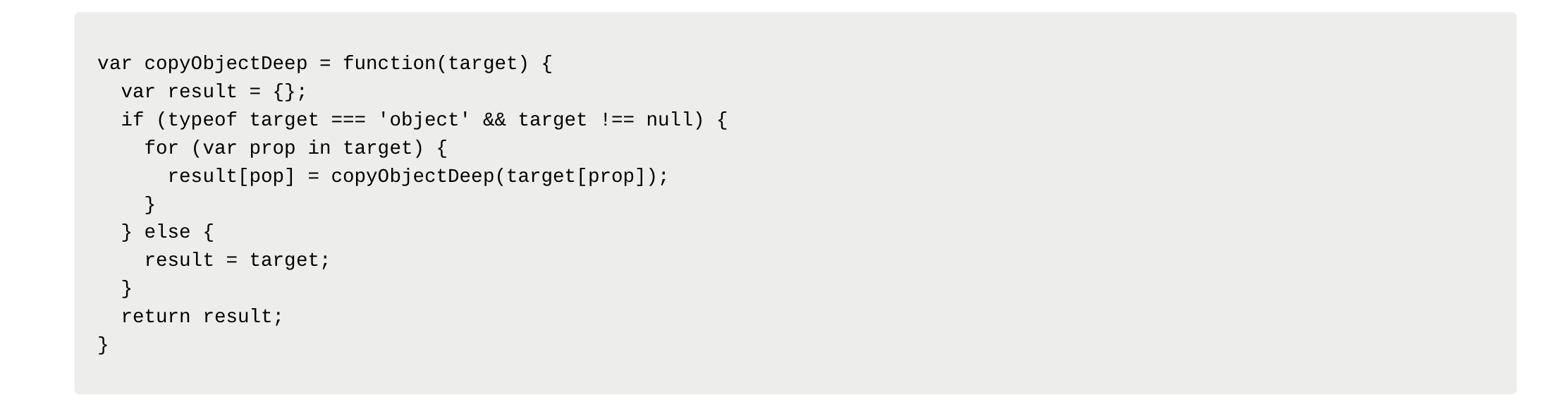 객체의 프로퍼티 중, 기본형 데이터는 그대로 복사하고 참조형 데이터는 다시 그 내부의 프로퍼티를 복사 -> 재귀적 수행