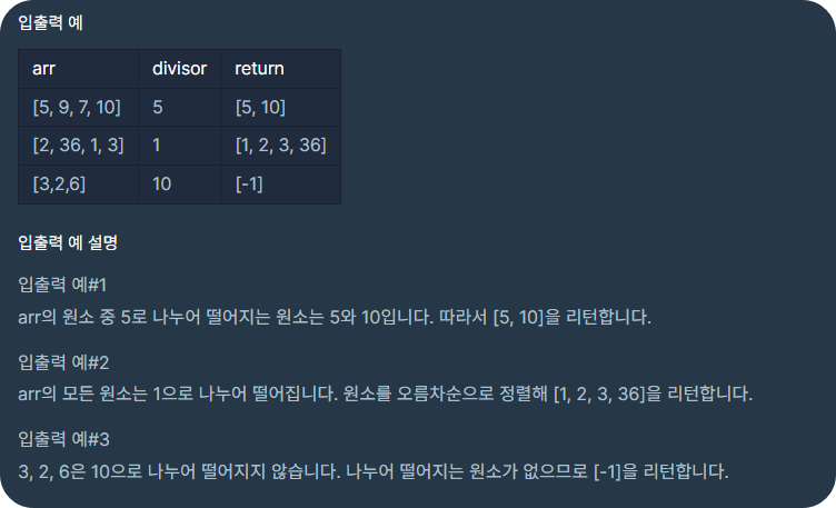 배열과 나눌 값을 매개변수로 받아서 나눌 값으로 나누었을 때 나누어 떨어지는 값들을 리턴하는 문제이다.