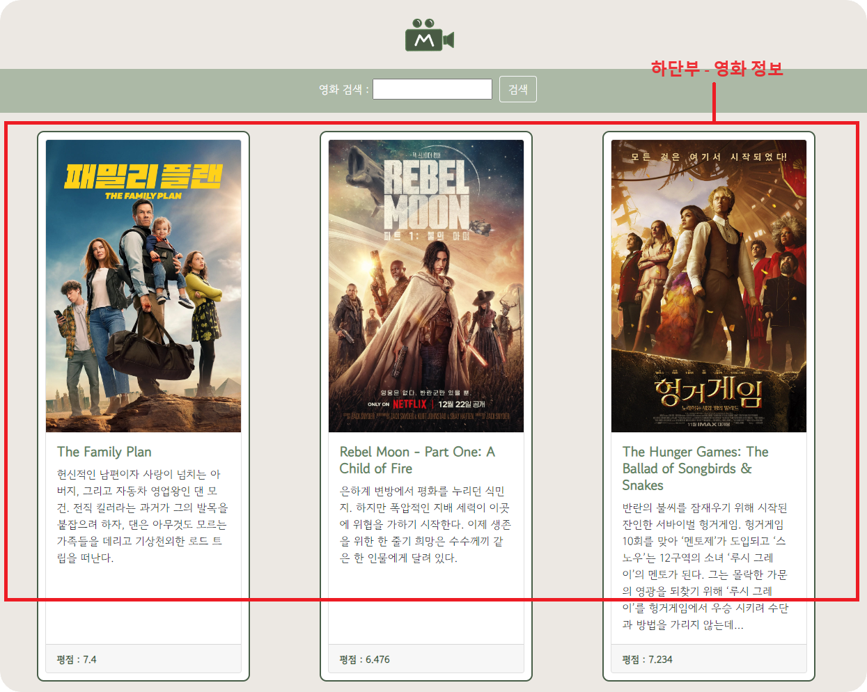 영화 포스터 이미지, 영화 제목, 영화 내용(줄거리), 평점 등을 가져와서 카드로 만들기 위해서 부트스트랩에 있는 Cards를 이용하였다. 그리고 모든 카드들을 div로 묶어서 css를 변경해주기위해 div에 mycards 클래스를 적용해주었다.
