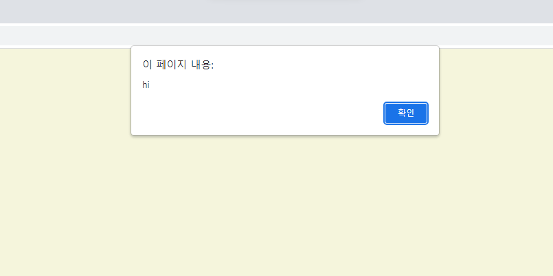 이로써 index.html을 실행시켰을때 웹 페이지에 css 파일을 통해 설정했던 베이지색 배경 컬러가 잘 적용되었음을 볼 수 있고 javascript 파일을 통해 hi를 띄우는 안내창이 뜨는 것을 볼 수 있다.