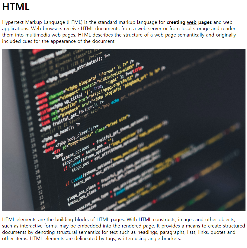 각 문단을 묶어서 분류해주는 태그. 각 문단을 묶어줌으로써 줄바꿈 태그인 <br>을 사용하지 않아도 자동 줄바꿈 가능